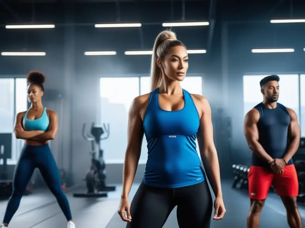 Un grupo diverso en un gimnasio moderno, usando activewear inclusivo para todos los cuerpos, celebrando la diversidad y la inclusividad en fitness
