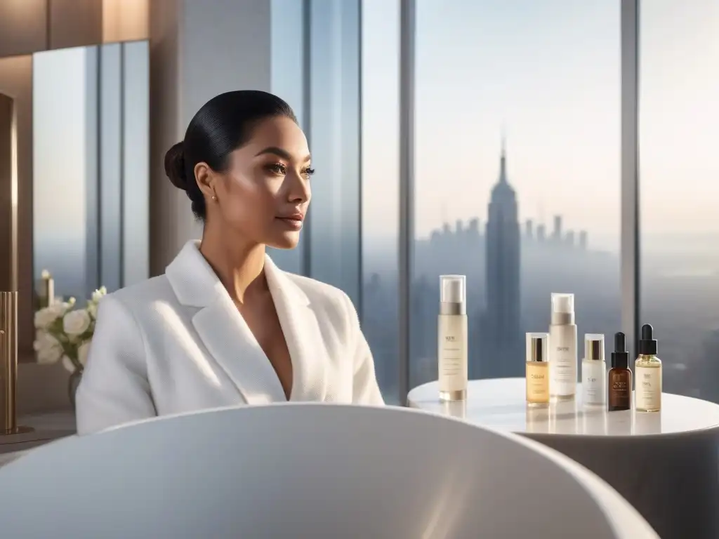 Un momento de cuidado de la piel en un lujoso baño de hotel con vistas a la ciudad
