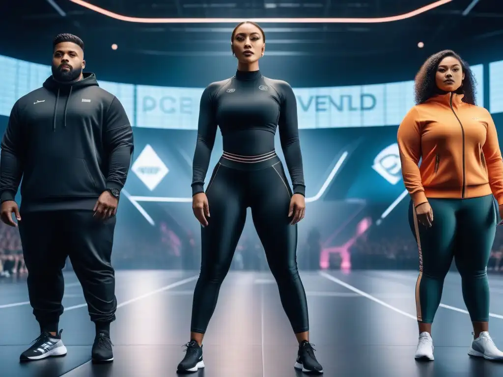 Grupo diverso de atletas en moda deportiva inclusiva tendencias, mostrando fuerza y determinación en una arena deportiva futurista