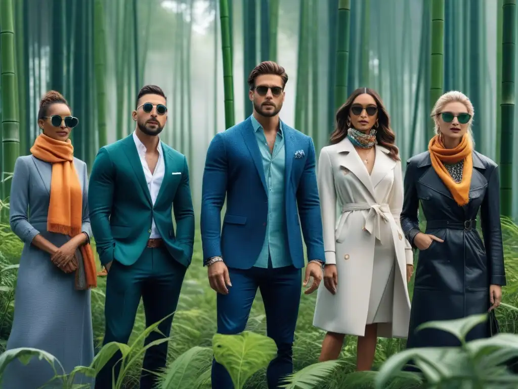 Una imagen de moda diversa con personas luciendo accesorios sostenibles en un entorno moderno y natural