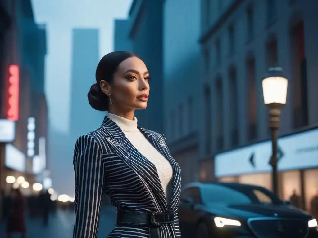 Una mujer petite camina con confianza por una concurrida calle de la ciudad, luciendo un elegante atuendo monocromático que realza su silueta