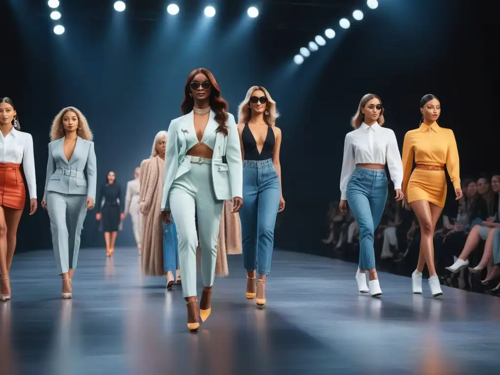 Una pasarela de moda inclusiva para mujeres petites, donde modelos desfilan con confianza en diseños elegantes y chic