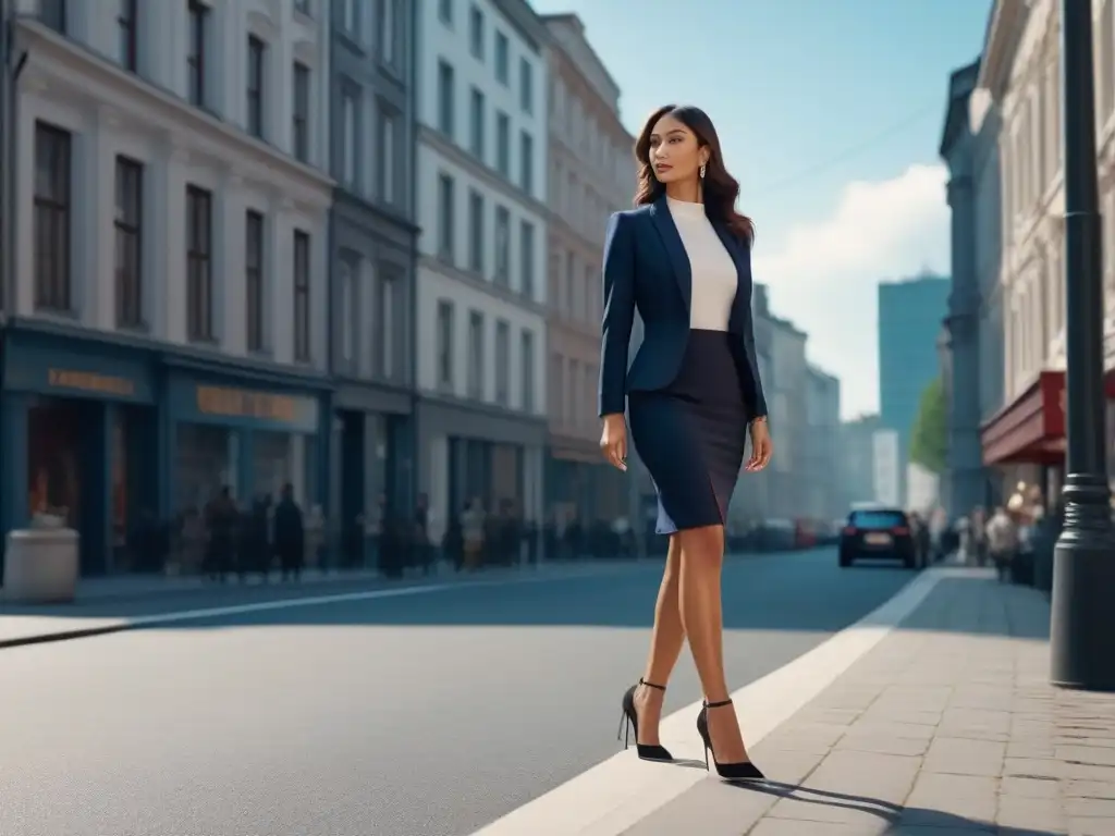 Una mujer petite segura camina por la ciudad, luciendo una falda lápiz elegante