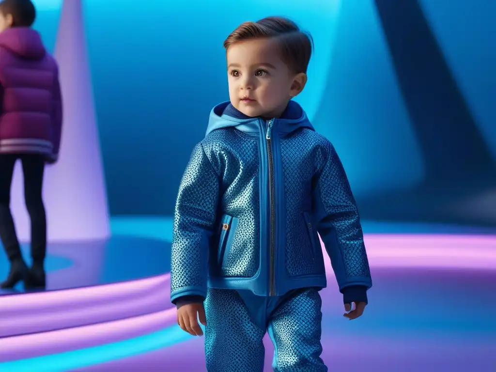 Un niño viste un traje futurista de materiales innovadores en moda infantil, en un escenario hightech y minimalista