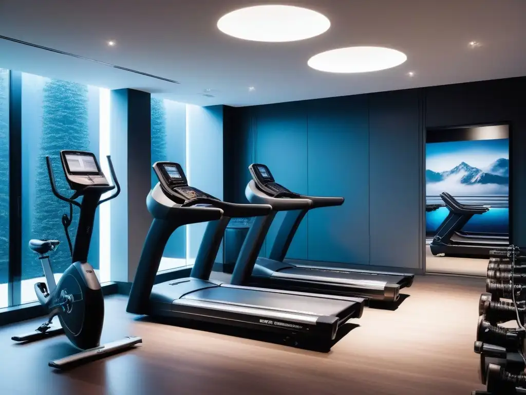 Elegante gimnasio futurista con equipamiento fitness de lujo y sofisticada iluminación ambiental