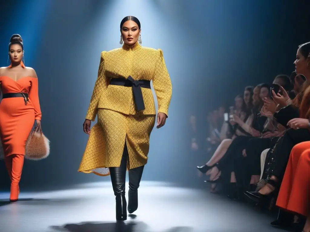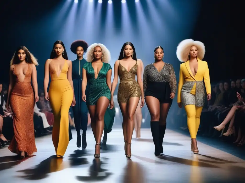 Desfile de moda inclusiva para todos cuerpos con modelos diversos y confiados en la pasarela, representando la inclusividad en la industria de la moda