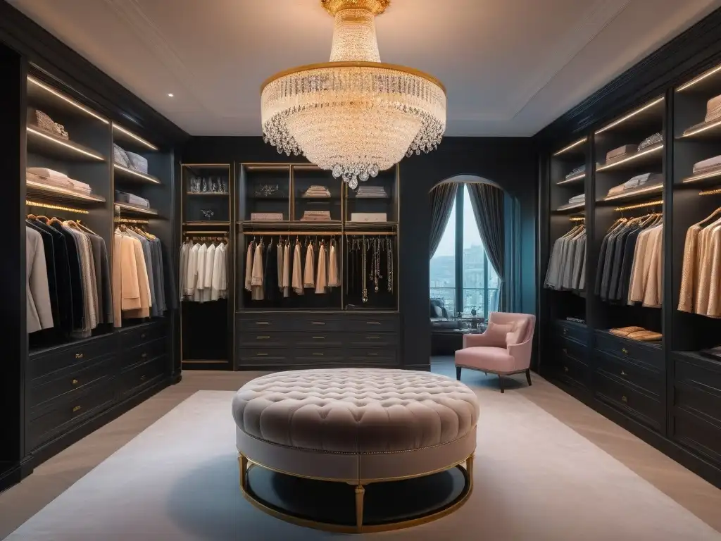 Un lujoso vestidor de moda con prendas y accesorios de lujo cuidadosamente organizados, consejos cuidado prendas moda lujo