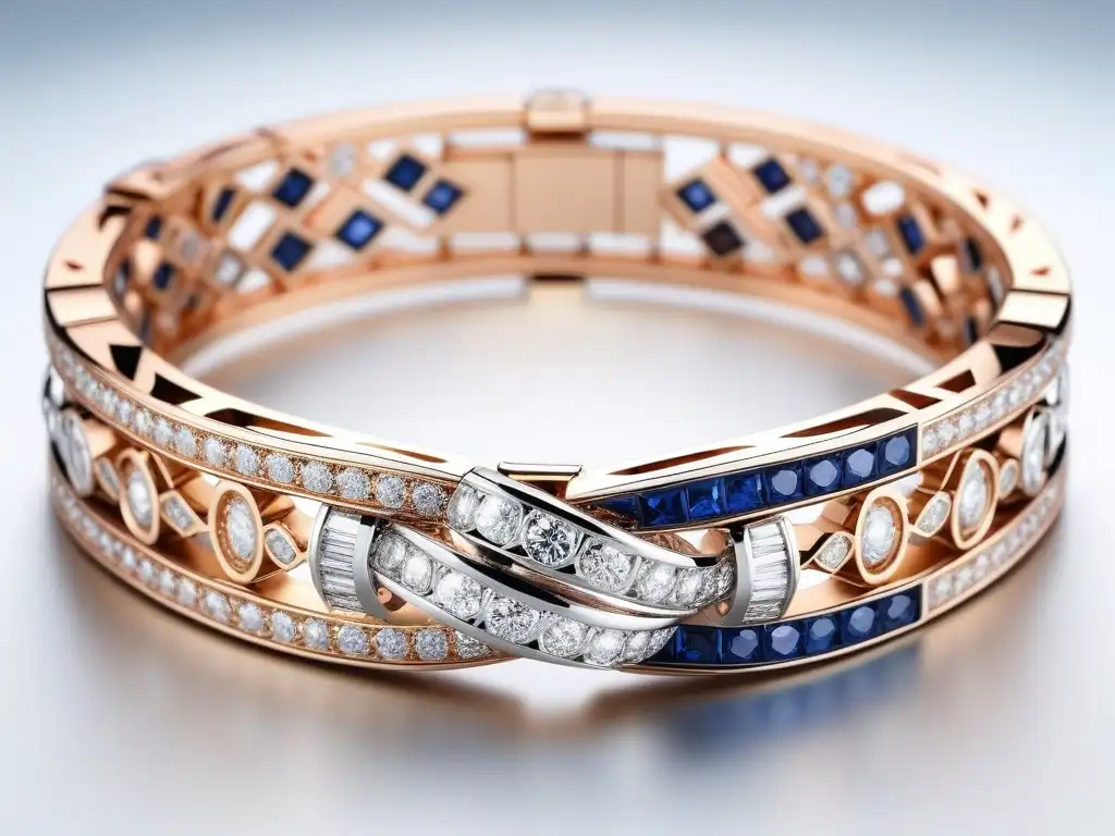 Una pulsera de lujo moderna y elegante con diamantes y zafiros, atrapando la luz y creando un brillo deslumbrante