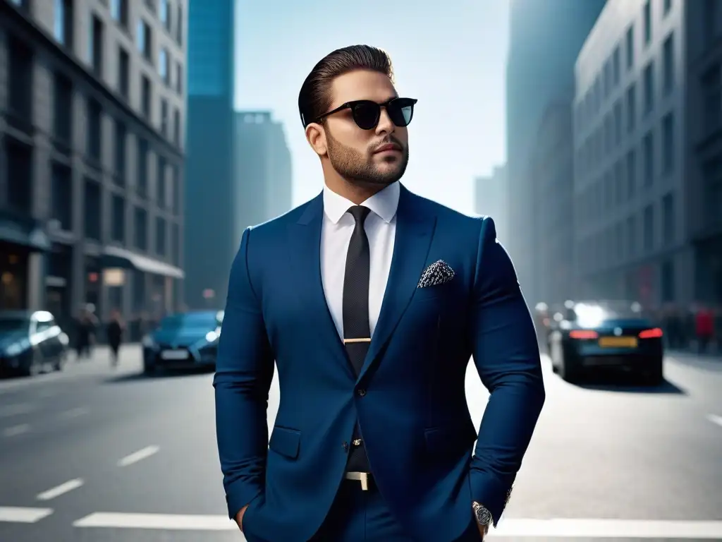 Un elegante hombre plus size camina confiado por la ciudad luciendo un traje a medida, en un ambiente urbano moderno