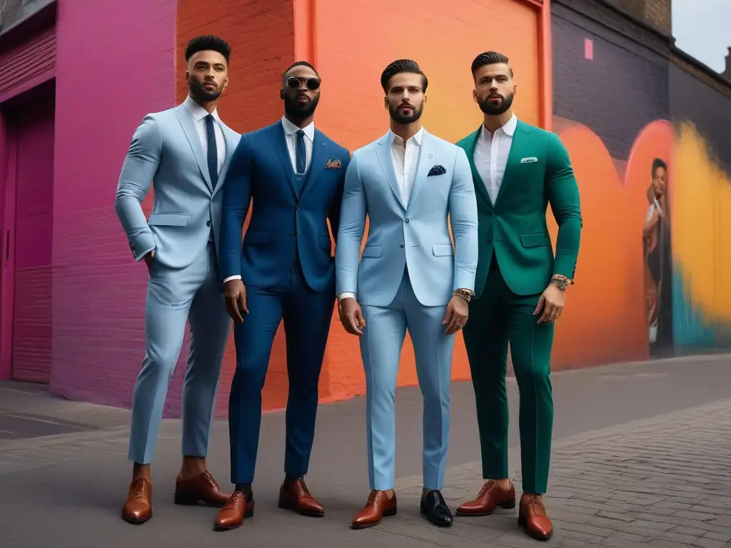 Un grupo diverso de hombres en trajes clásicos con un toque moderno, en un entorno urbano colorido