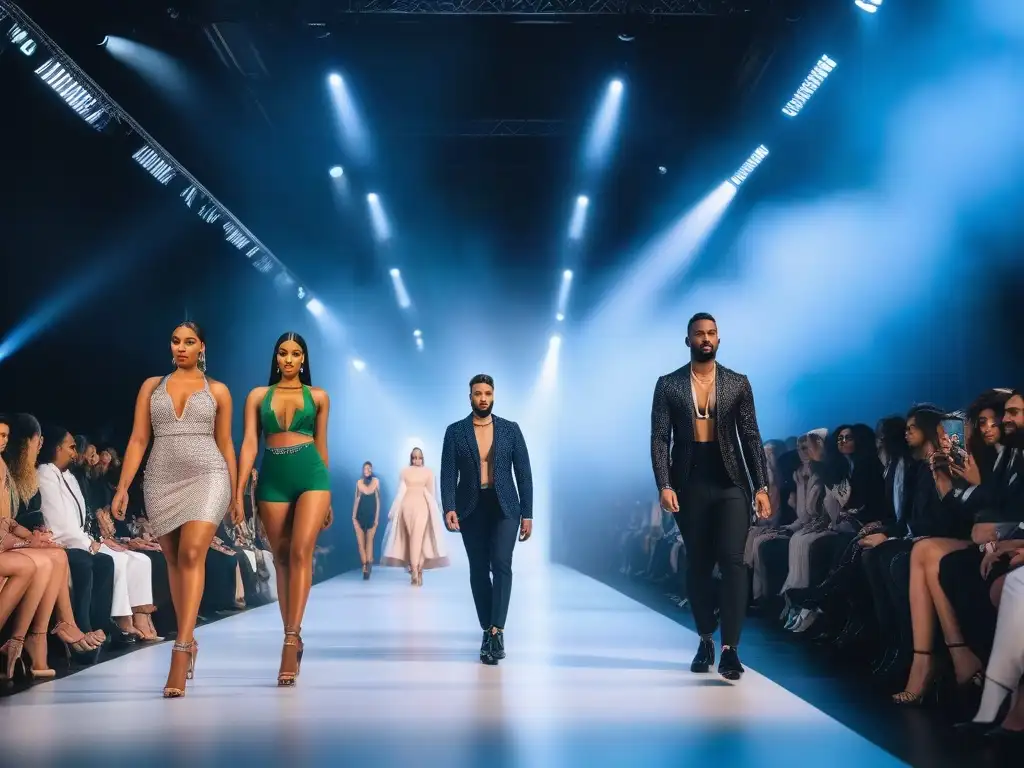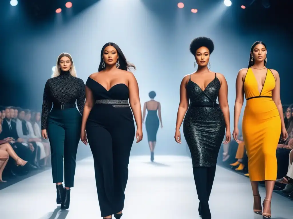 Una impactante pasarela de moda inclusiva para todos cuerpos, con modelos diversos exhibiendo confianza y estilo