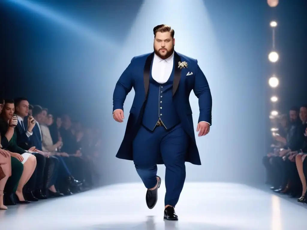 Un modelo de moda plus size para hombres desfilando con estilo y confianza, desafiando estándares de belleza tradicionales