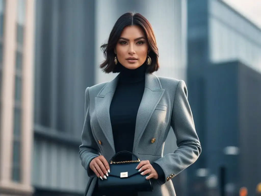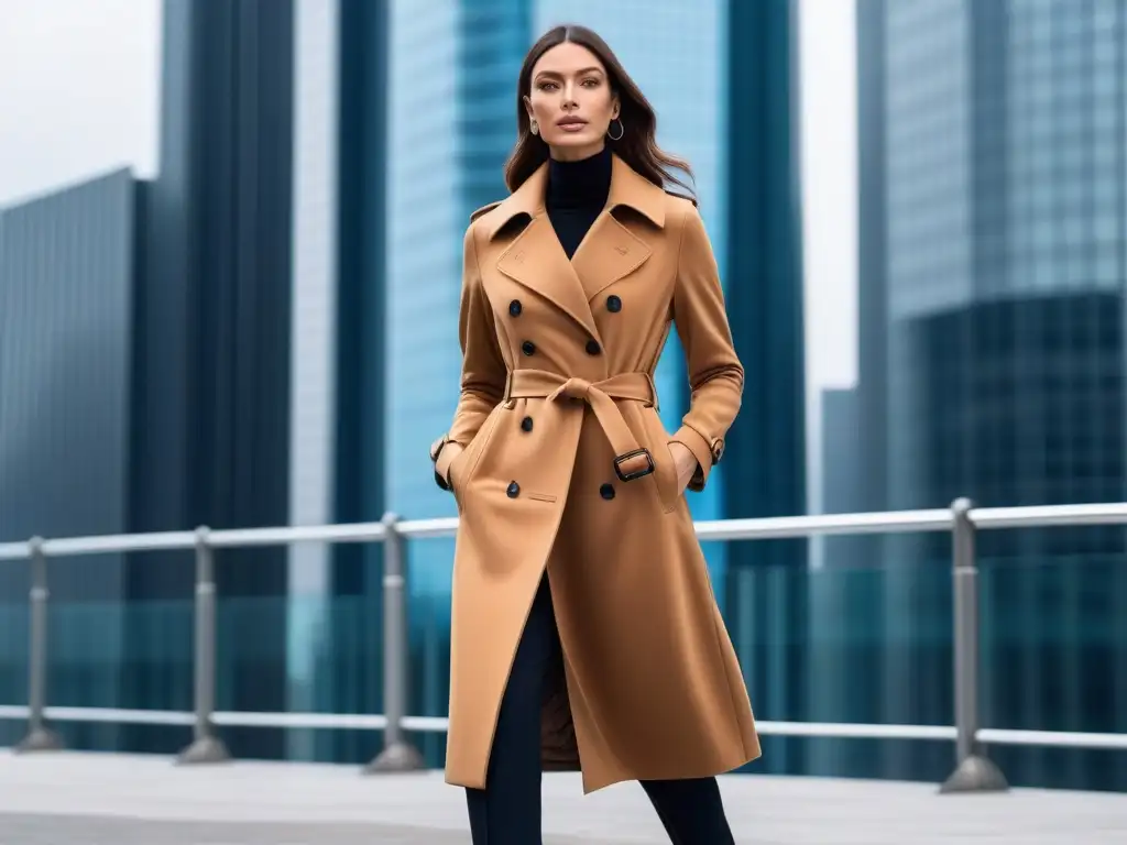 Mujer elegante en chaqueta tailoring larga en entorno urbano moderno