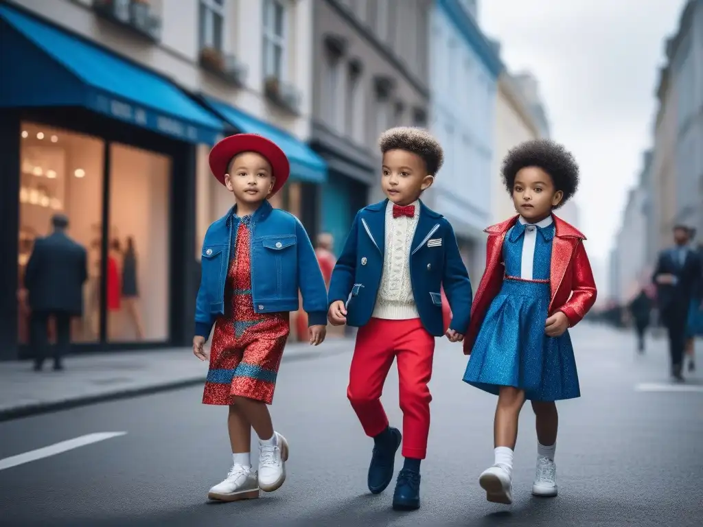 Un desfile urbano de moda infantil tendencias predicciones, con niños modernos y coloridos paseando por la ciudad