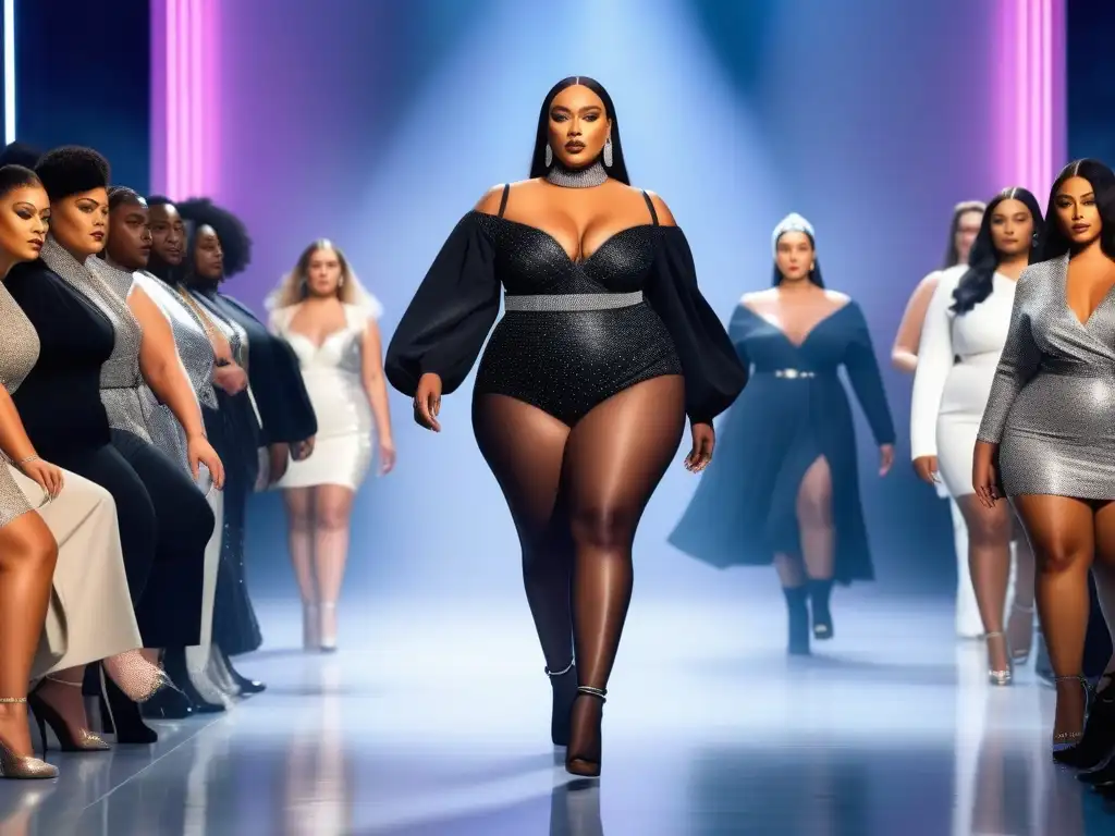 Desfile de moda plus size 2023 con modelos seguras y diversas luciendo las últimas tendencias en una pasarela futurista y elegante