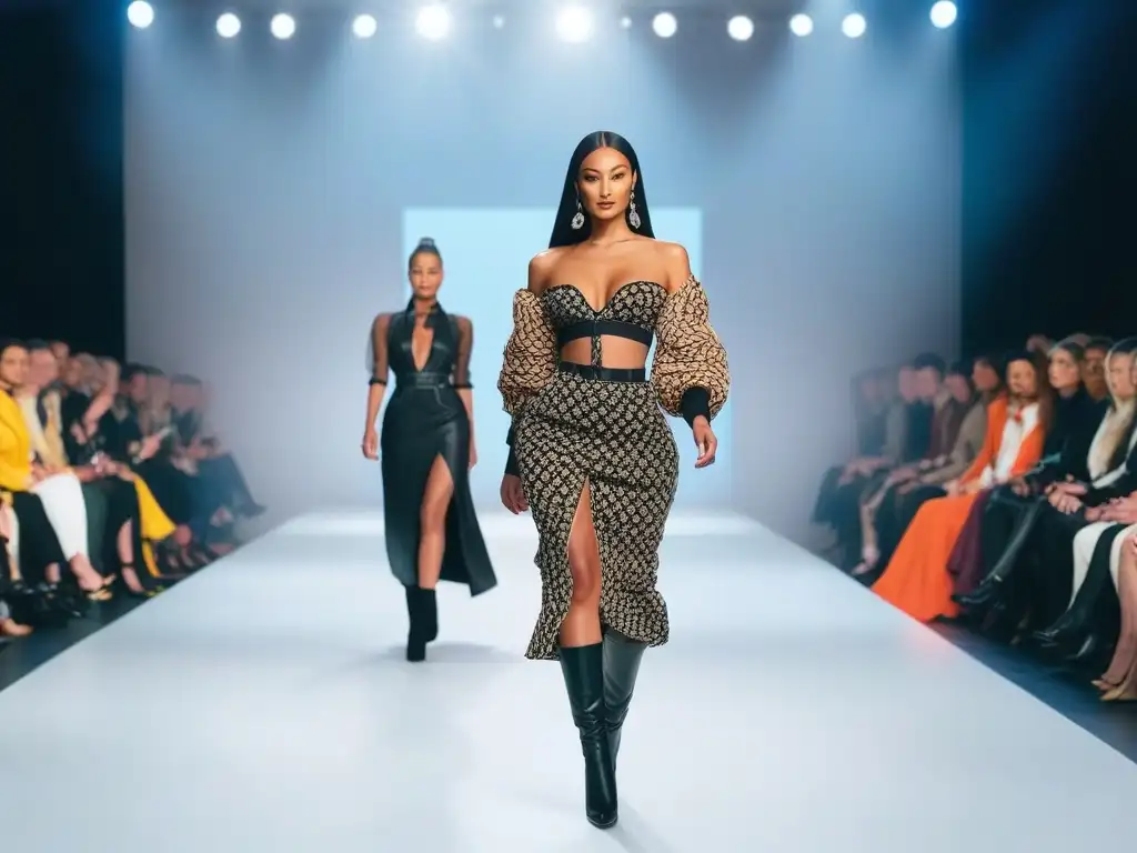 Una pasarela futurista con modelos de diferentes etnias y cuerpos luciendo moda sostenible, en un ambiente inclusivo y tecnológico