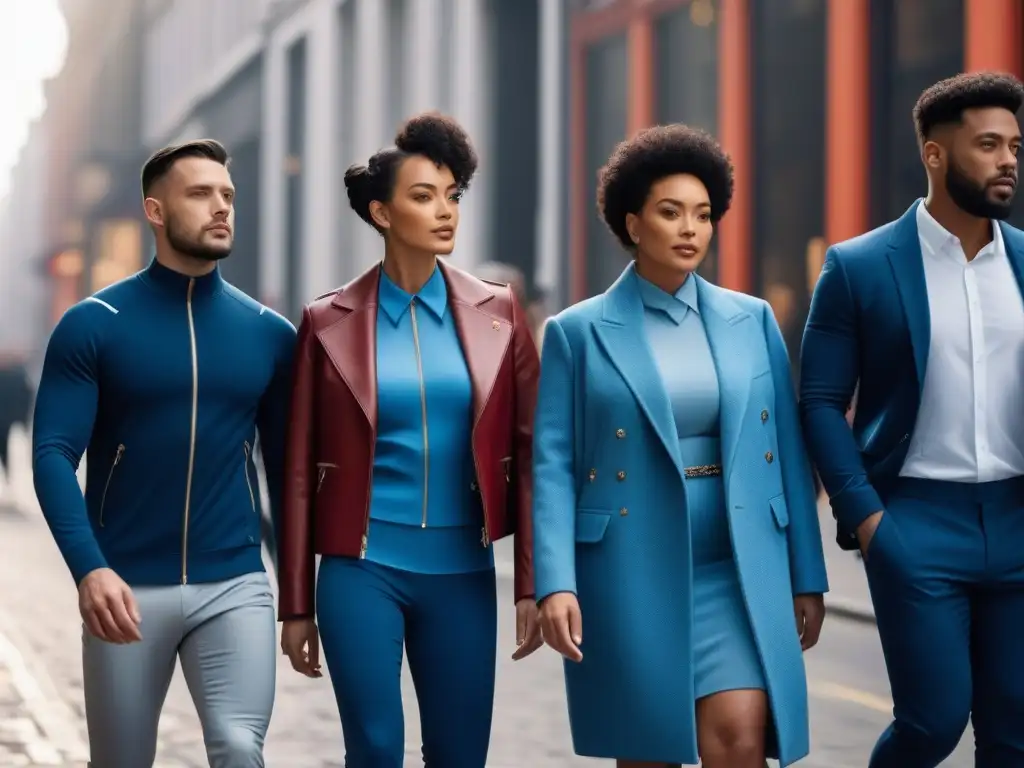 Un grupo diverso de personas camina con confianza por una concurrida calle de la ciudad, vistiendo moda inclusiva para todos los cuerpos