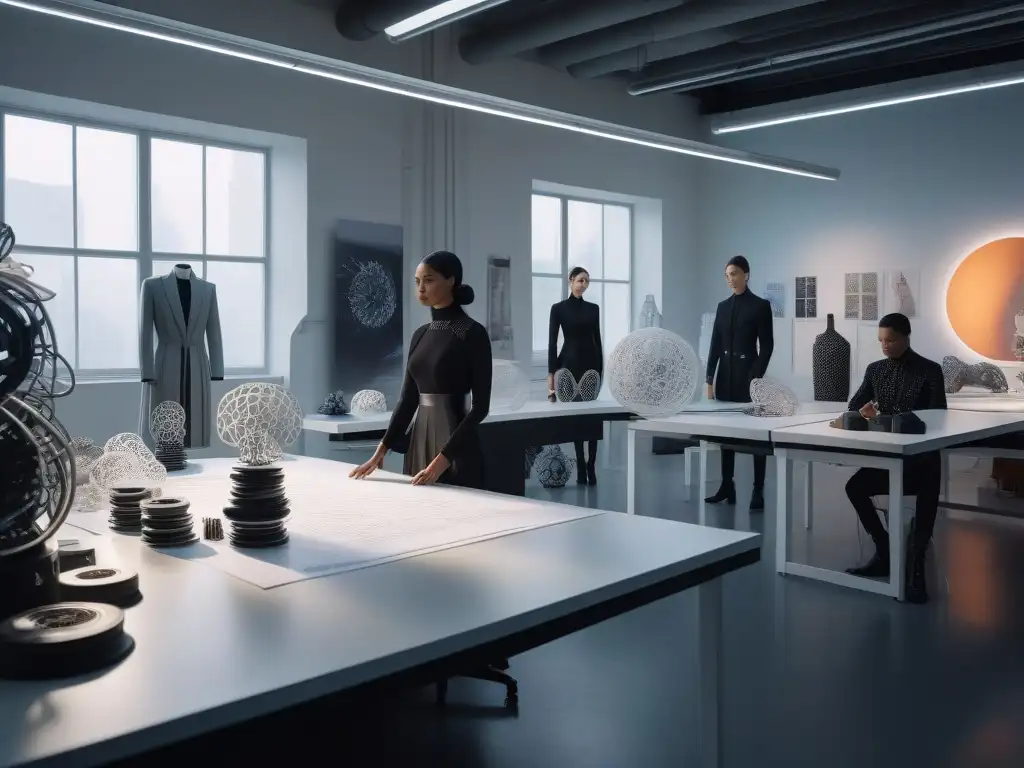 Un equipo diverso de diseñadores de moda crea prendas avant-garde con impresión 3D en un estudio futurista lleno de creatividad e innovación