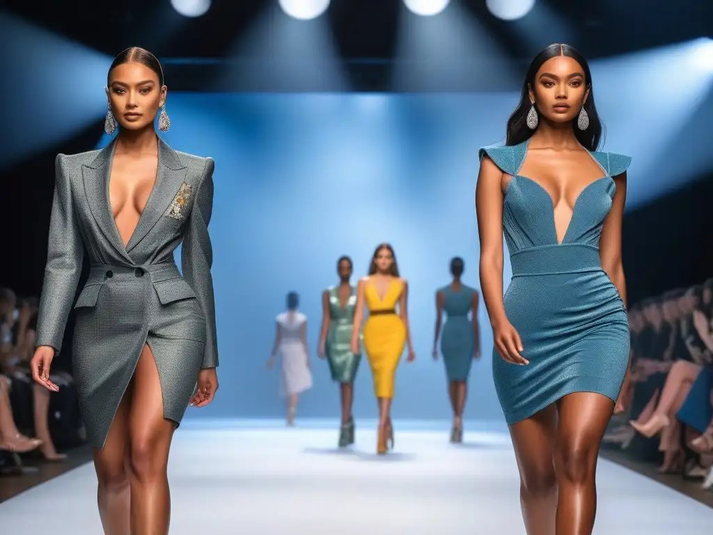 Desfile de moda adaptativa para todos cuerpos en una pasarela de lujo y estilo futurista