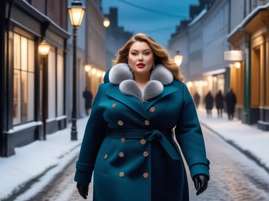 Una modelo plus size, segura, camina en una ciudad invernal con un elegante abrigo plus size