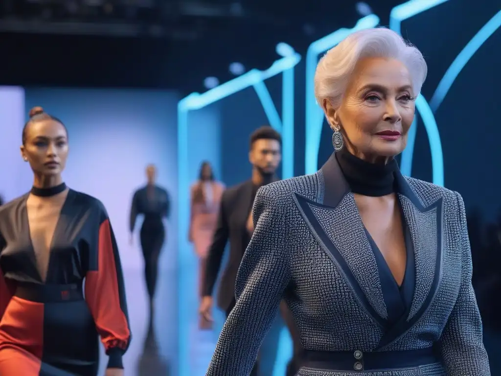 Desfile de moda senior innovadora con tecnología inclusiva en pasarela futurista
