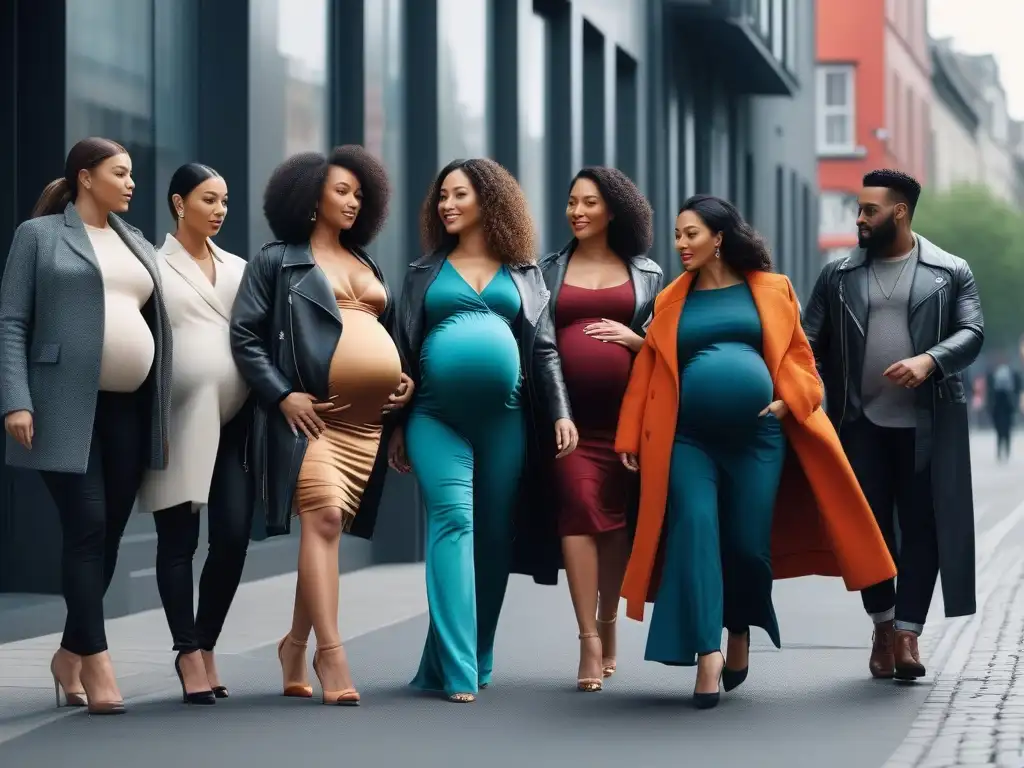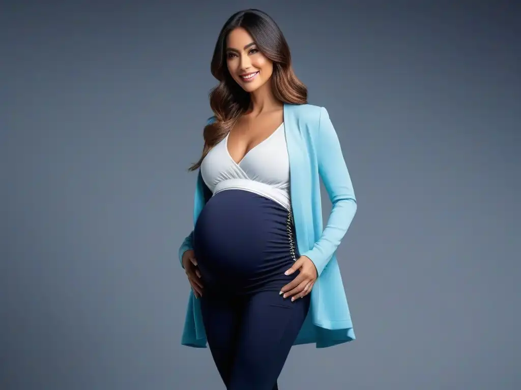 Una mujer embarazada viste ropa maternal ajustable y cómoda, irradiando empoderamiento y confianza