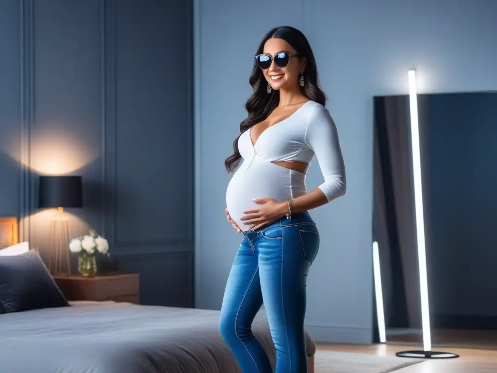 Combina tus jeans maternales con blusas ajustadas en la parte superior, accesorios llamativos y calzado cómodo para un look moderno y elegante durante el embarazo.