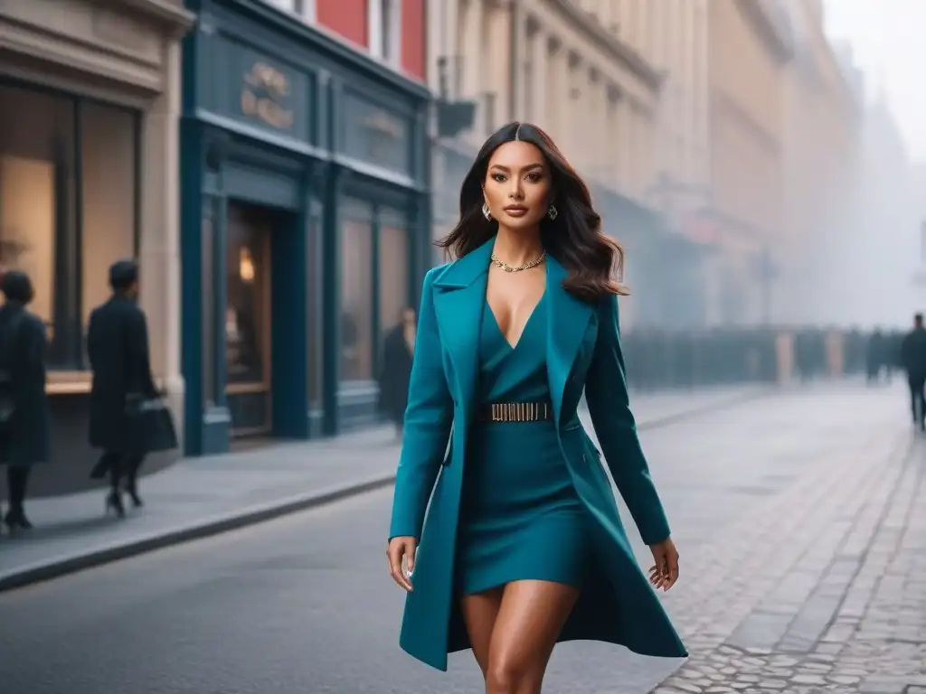 Una mujer elegante caminando con confianza por la ciudad, luciendo un atuendo moderno y chic
