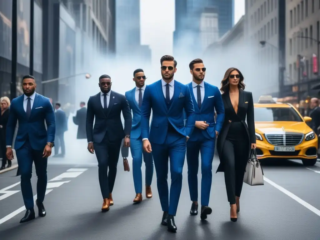 Un grupo de altos elegantes paseando con confianza por una bulliciosa calle de la ciudad, en un escenario de moda urbana aspiracional