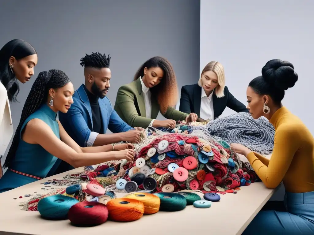 Un equipo diverso de diseñadores de moda colabora apasionadamente en un estudio luminoso, con materiales reciclados