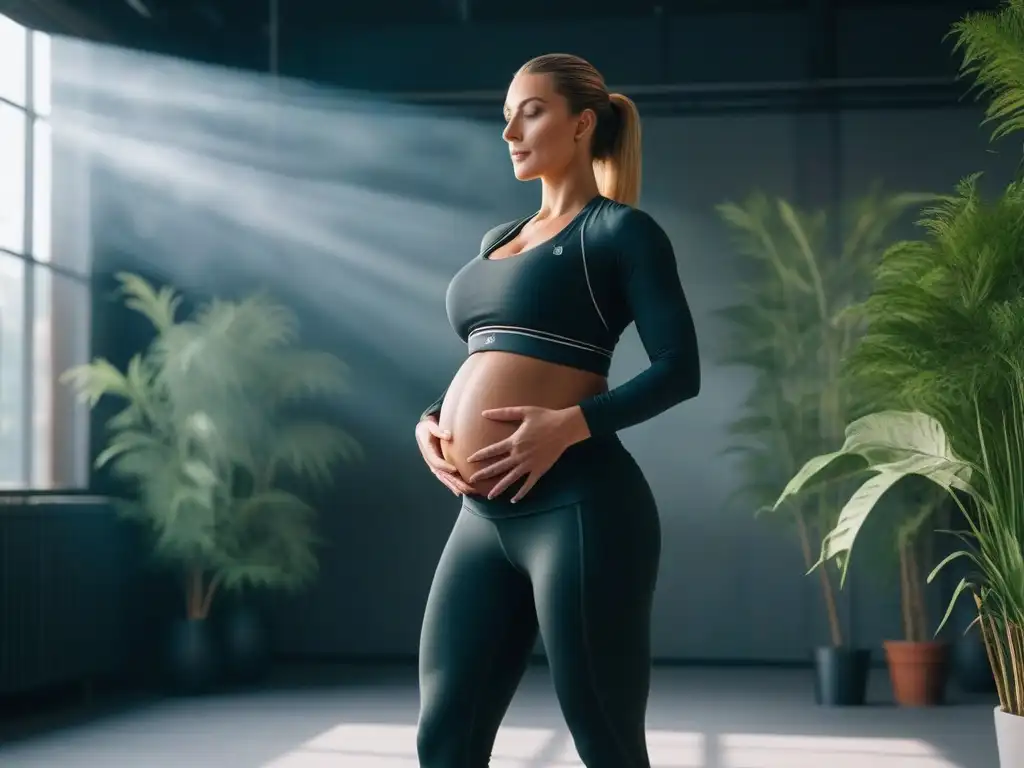 Una mujer embarazada en ropa ejercicio maternal cómoda y activa, estirándose en un ambiente sereno y armonioso