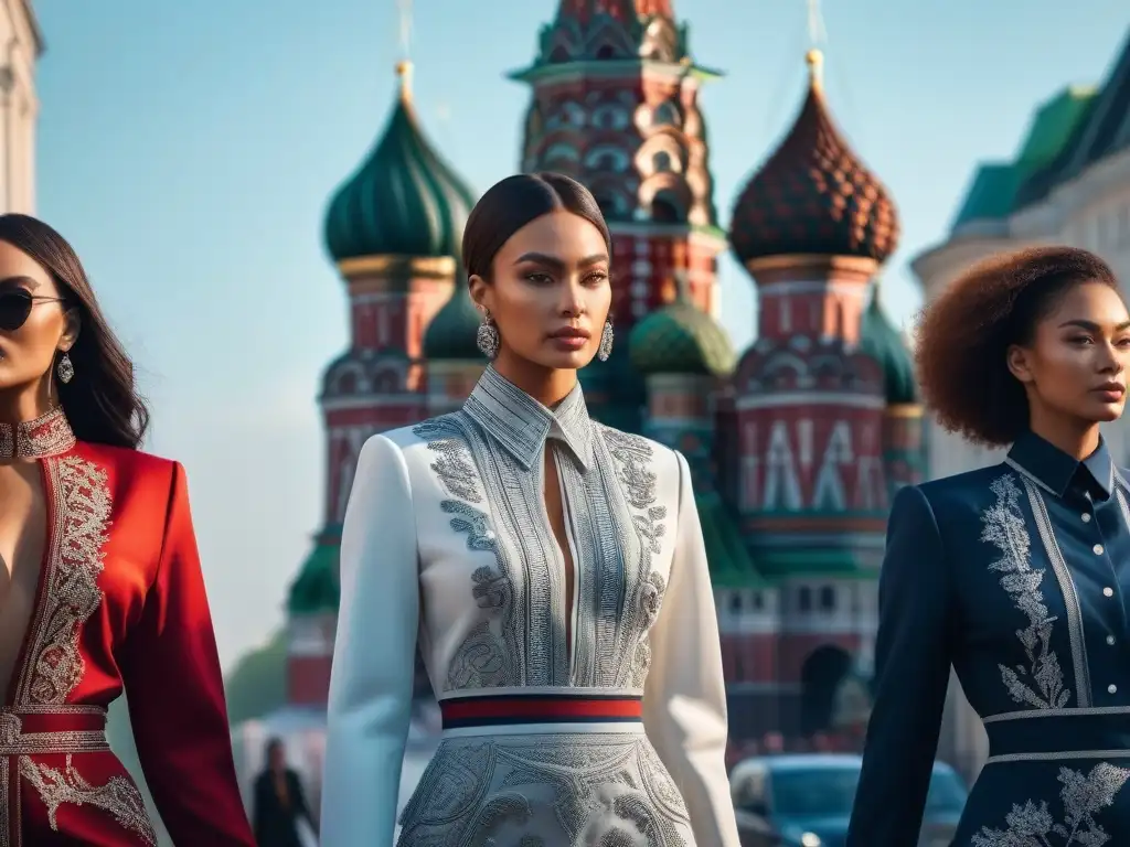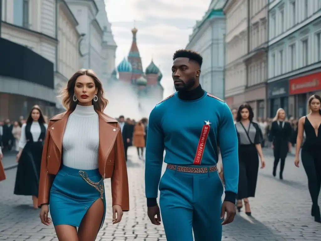 Un desfile de moda para cuerpos diversos en Moscú, fusionando estilos tradicionales y modernos en un contexto urbano vibrante