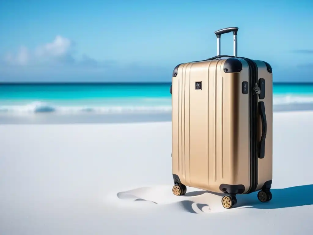 Equipaje de lujo para luna de miel en paradisíaca playa con maleta elegante brillando bajo el sol